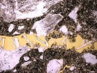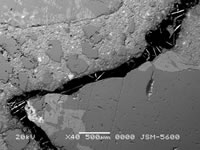 BEI拍攝的與上圖相同 裂縫表明澎內(nèi)傳系統(tǒng) 生成晶體正在密封該裂縫 |