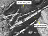 放大的圖片清楚地顯示 裂縫中的粗糙長晶體 和細(xì)小針狀晶體 |